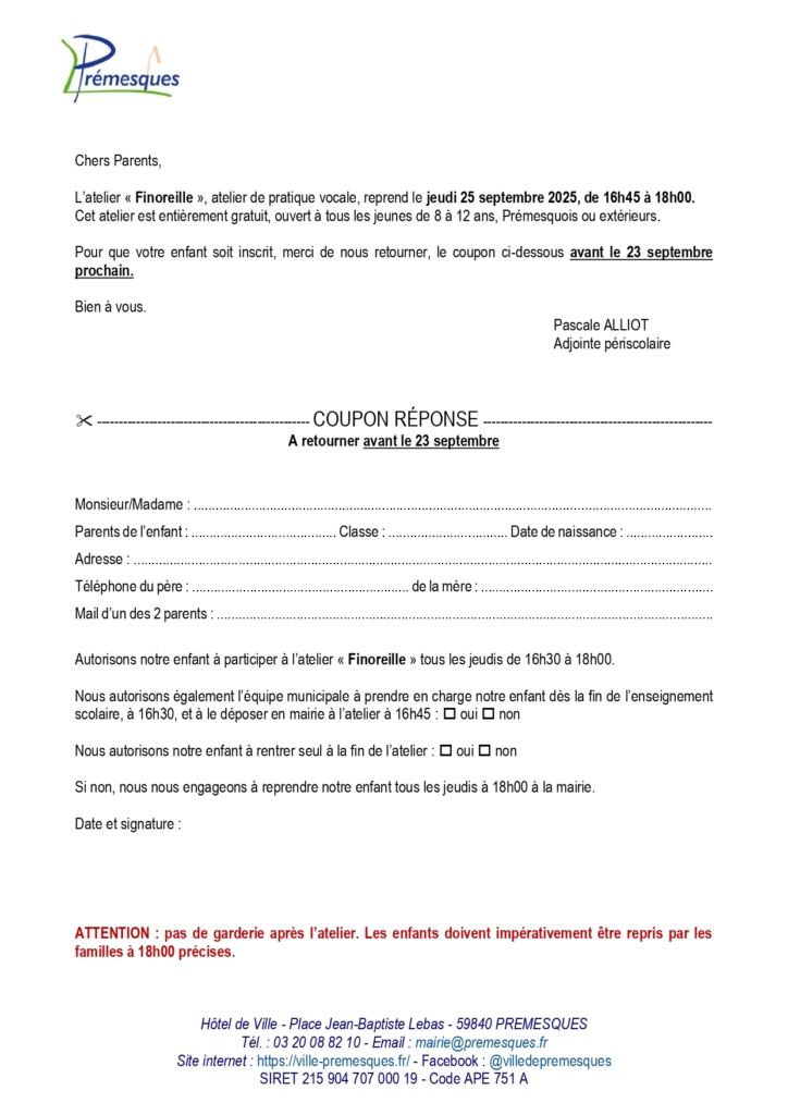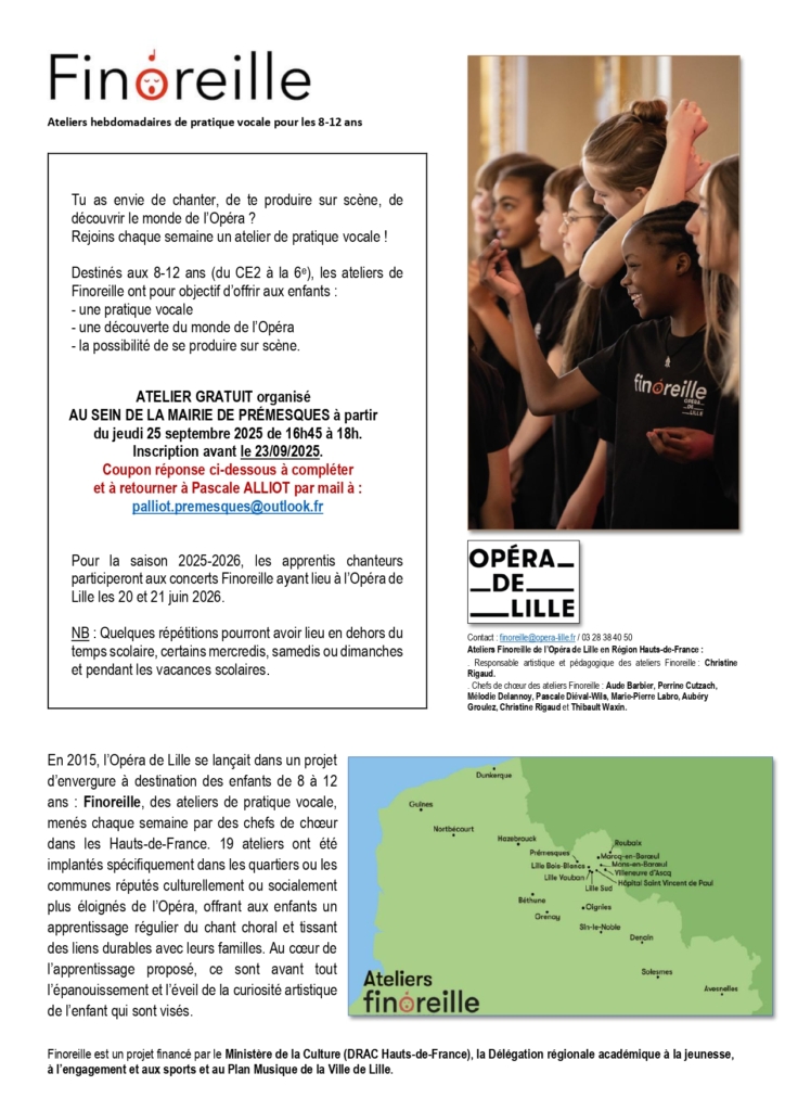 Depuis plusieurs années, la commune de Prémesques a le plaisir de collaborer avec l’Opéra de Lille dans le cadre du projet Finoreille. Destiné aux enfants de 8 à 12 ans, ce dispositif propose chaque semaine des ateliers de pratique vocale encadrés par des chefs de chœur professionnels.