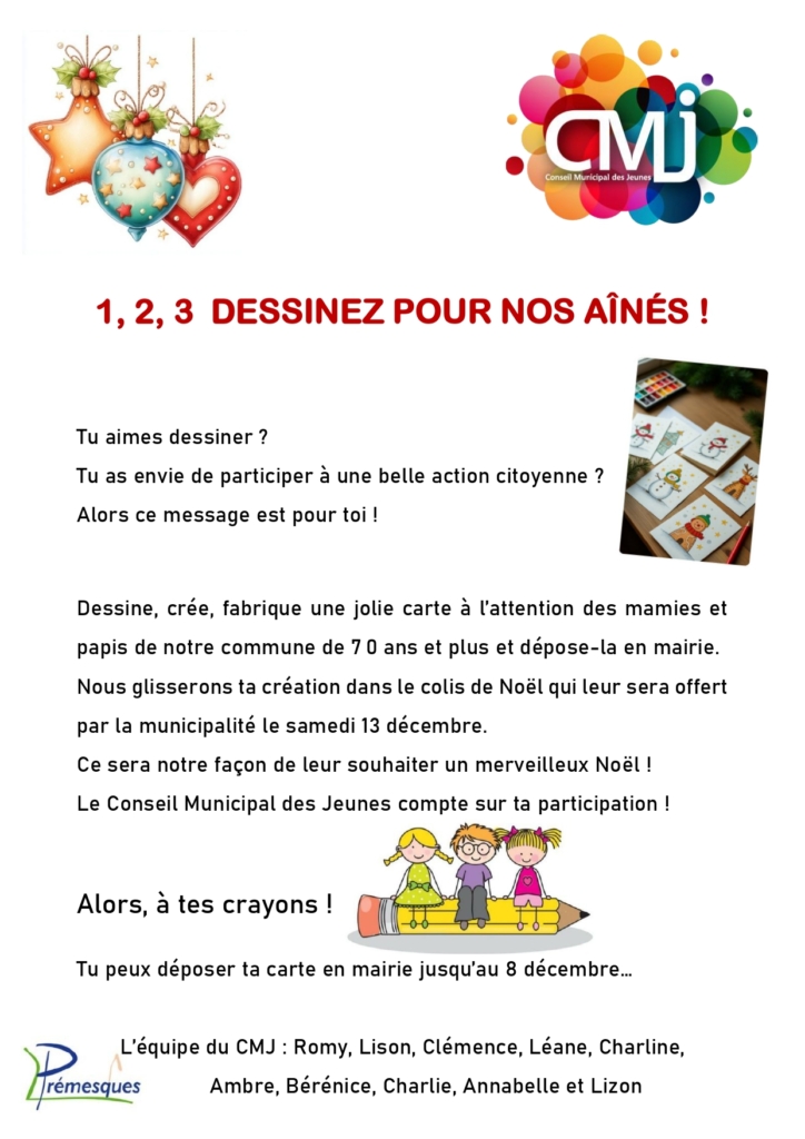 À l’approche des fêtes, le Conseil Municipal des Jeunes de Prémesques relance une belle initiative pleine de douceur et de générosité : inviter les enfants du village à réaliser une carte de Noël destinée à nos aînés.
