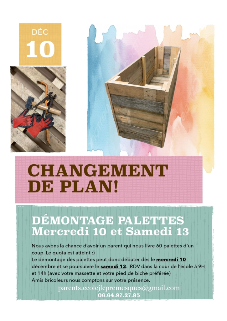 Bonne nouvelle : l’appel à palettes lancé récemment a déjà porté ses fruits ! Un parent d’élève a pu récupérer 60 palettes d’un coup, de quoi couvrir l’ensemble du projet. Merci à toutes celles et ceux qui s’étaient mobilisés pour en trouver.