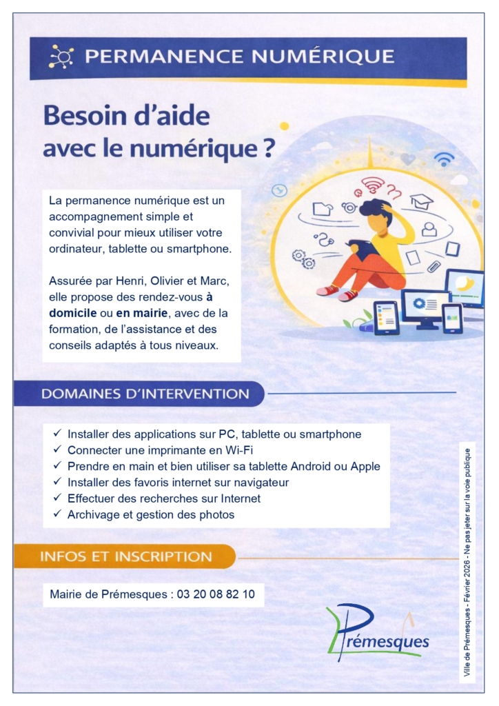 Consciente de ces enjeux, la Ville de Prémesques met en place une permanence numérique, destinée à accompagner les habitants qui rencontrent des difficultés avec l’outil informatique ou qui souhaitent simplement gagner en autonomie.