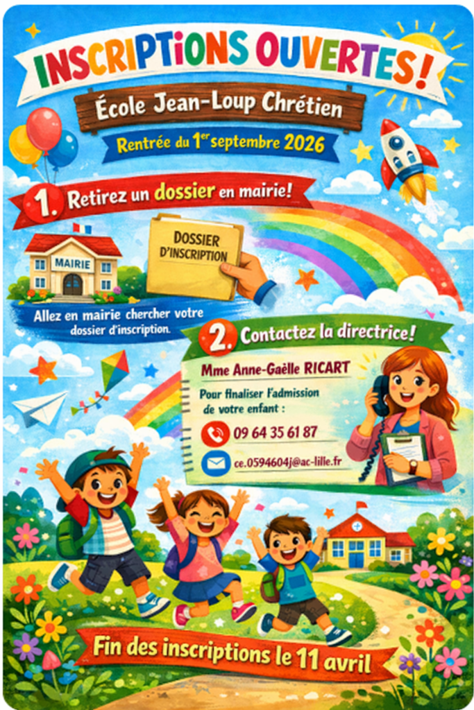 Les inscriptions scolaires pour la rentrée de septembre 2026 à l’école Jean-Loup Chrétien sont en cours.