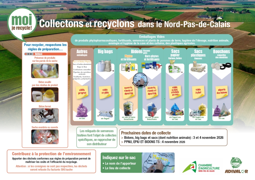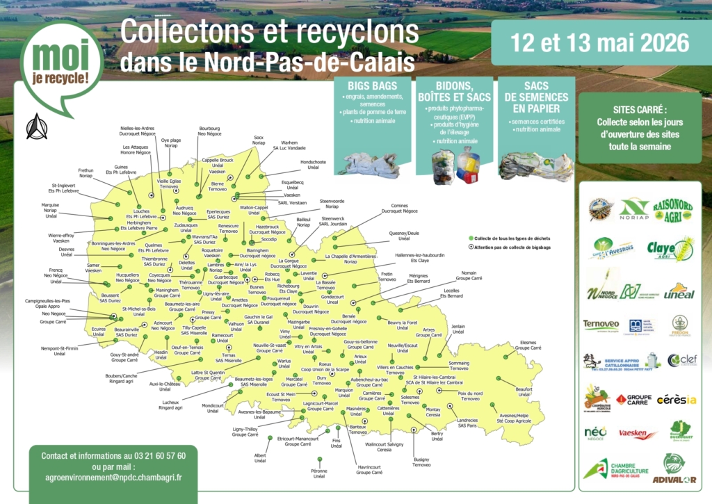 Dans le cadre des actions en faveur de l’environnement, une collecte de déchets issus de l’agrofourniture est organisée les 12 et 13 mai 2026 sur l’ensemble du territoire du Nord–Pas-de-Calais.