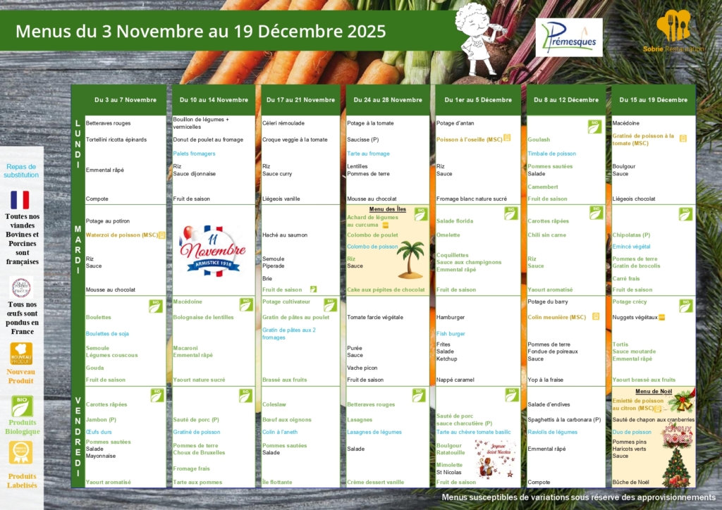Menus de cantine du 3 novembre au 19 décembre 2025
