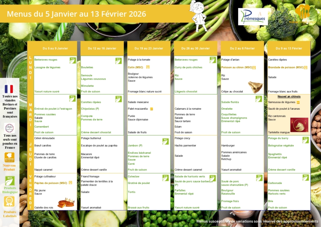 Menus de cantine du 5 janvier au 13 février 2026