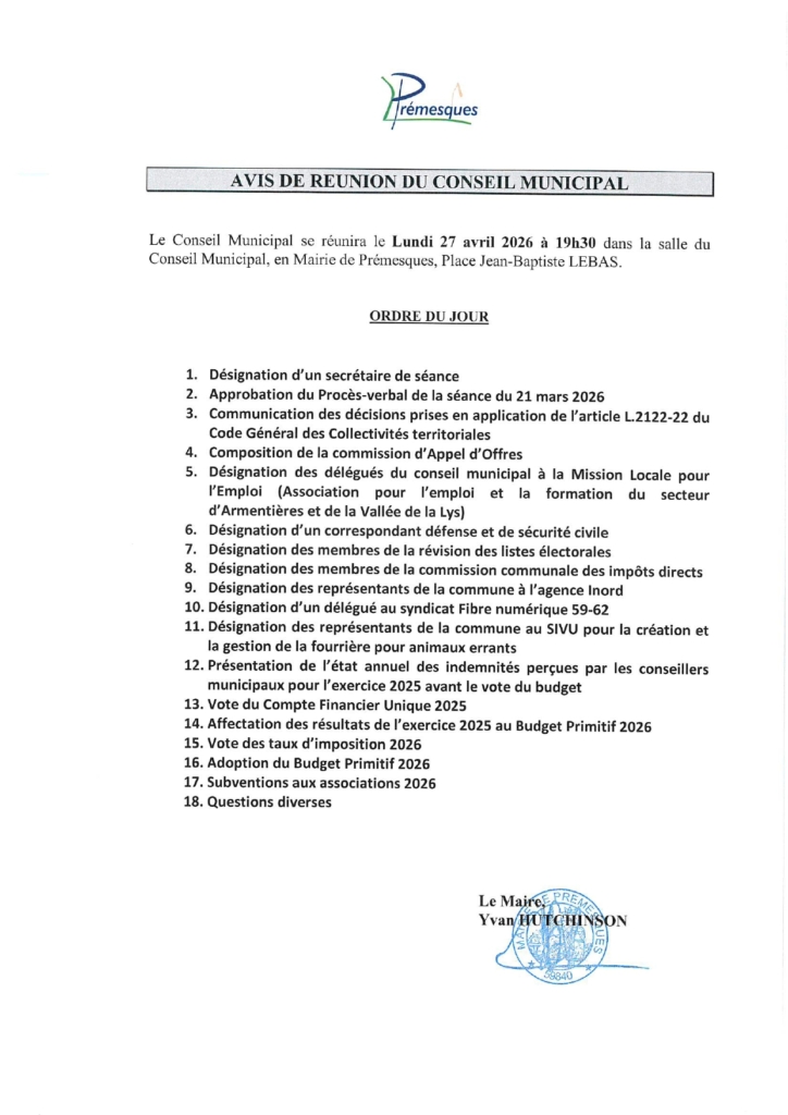Le prochain Conseil Municipal se tiendra le lundi 27 avril 2026 à 19h30 en Mairie, salle du Conseil Municipal (1er étage).