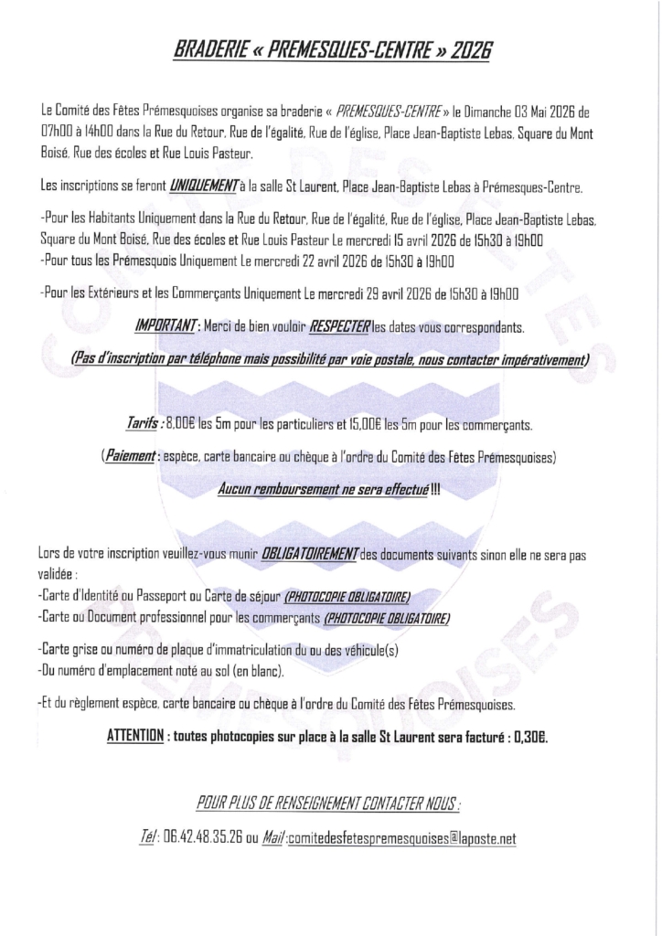 Pour toute information complémentaire, vous pouvez contacter le Comité des Fêtes Prémesquoises.