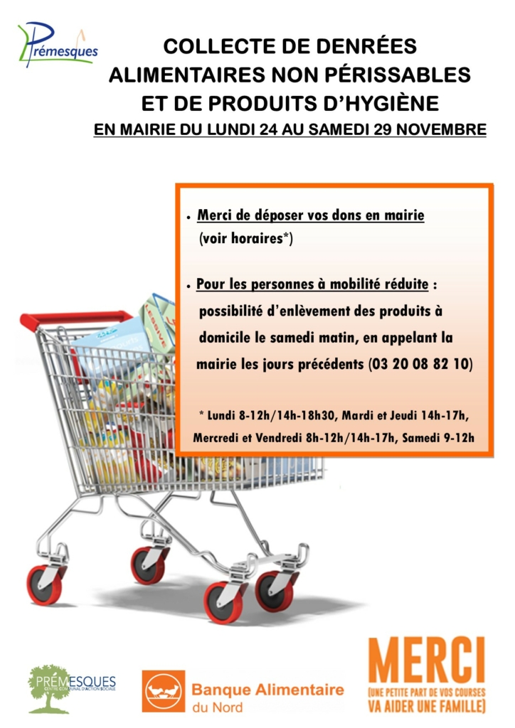 À Prémesques, nous avons le souhait de participer activement à cette démarche. Du lundi 24 au samedi 29 novembre, une collecte de denrées non périssables et de produits d’hygiène se tiendra à la mairie. Chaque produit déposé est un geste concret de soutien, un message de fraternité pour ceux qui traversent une difficulté.