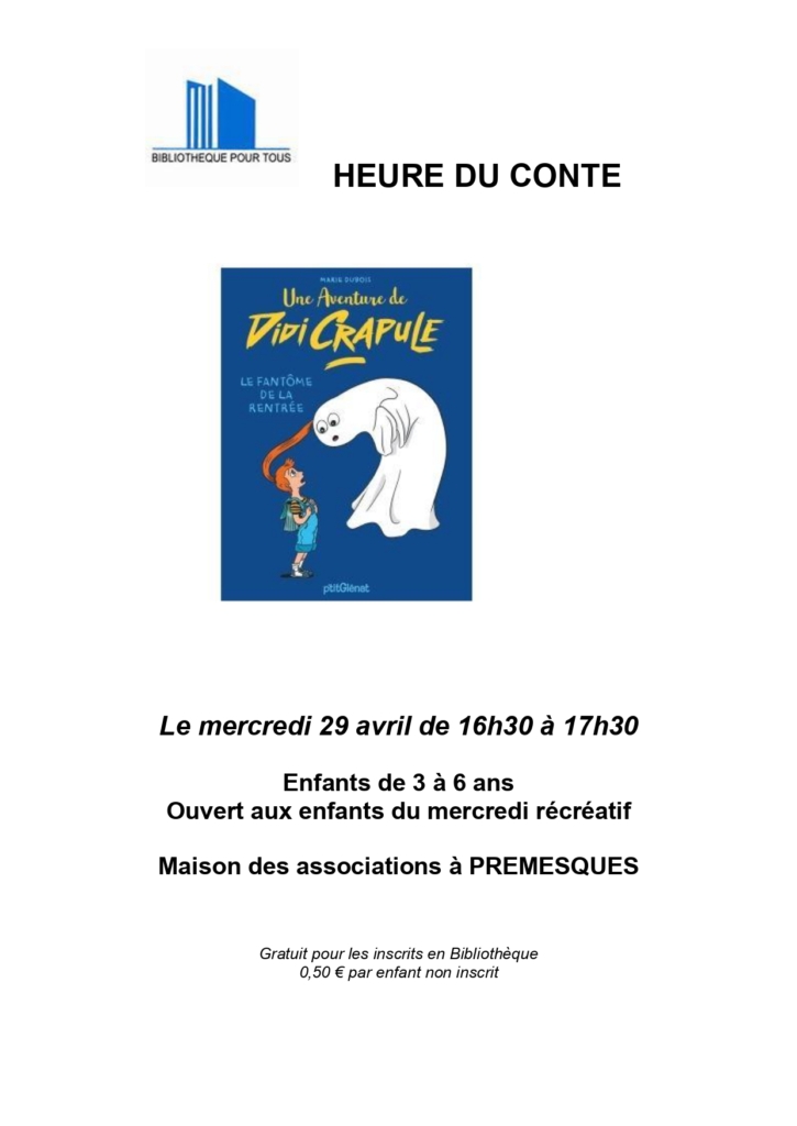 La Bibliothèque Pour Tous de Prémesques a le plaisir de proposer une nouvelle Heure du conte, un moment privilégié pour éveiller l’imaginaire des plus jeunes et partager le plaisir des histoires.