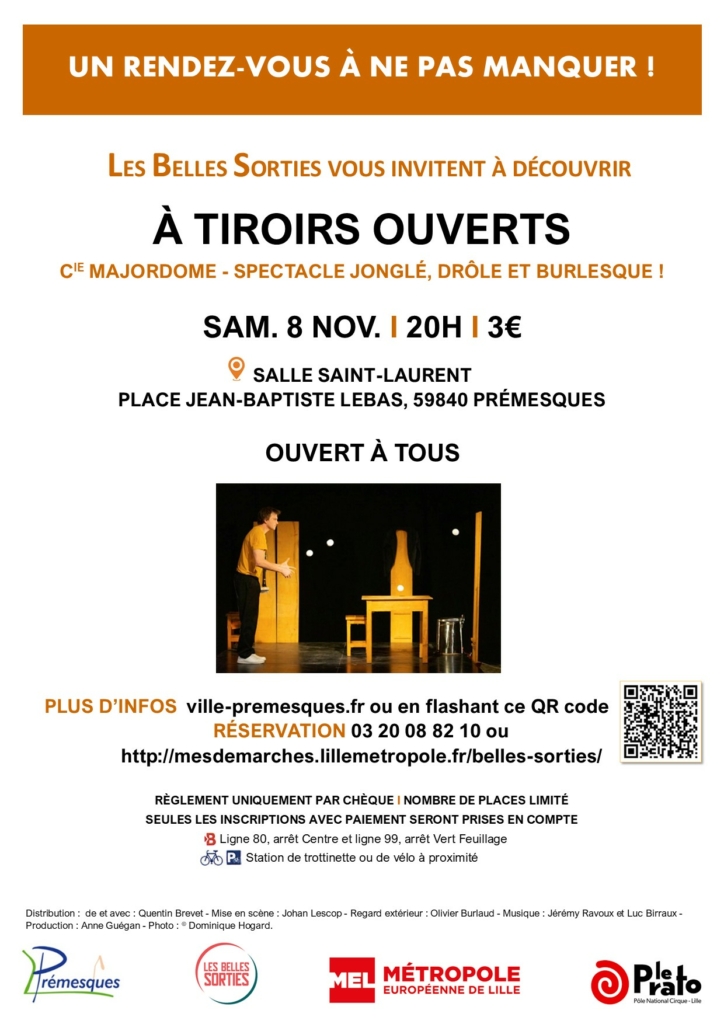 Rendez-vous le samedi 8 novembre à 20h, à la salle Saint-Laurent, pour découvrir le spectacle À tiroirs ouverts, présenté par la compagnie Majordome.